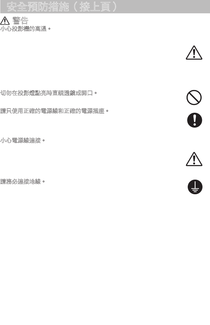 切勿在使用中或使用後馬上觸摸透鏡、換氣扇、通風口以防止燒傷。注意通風。